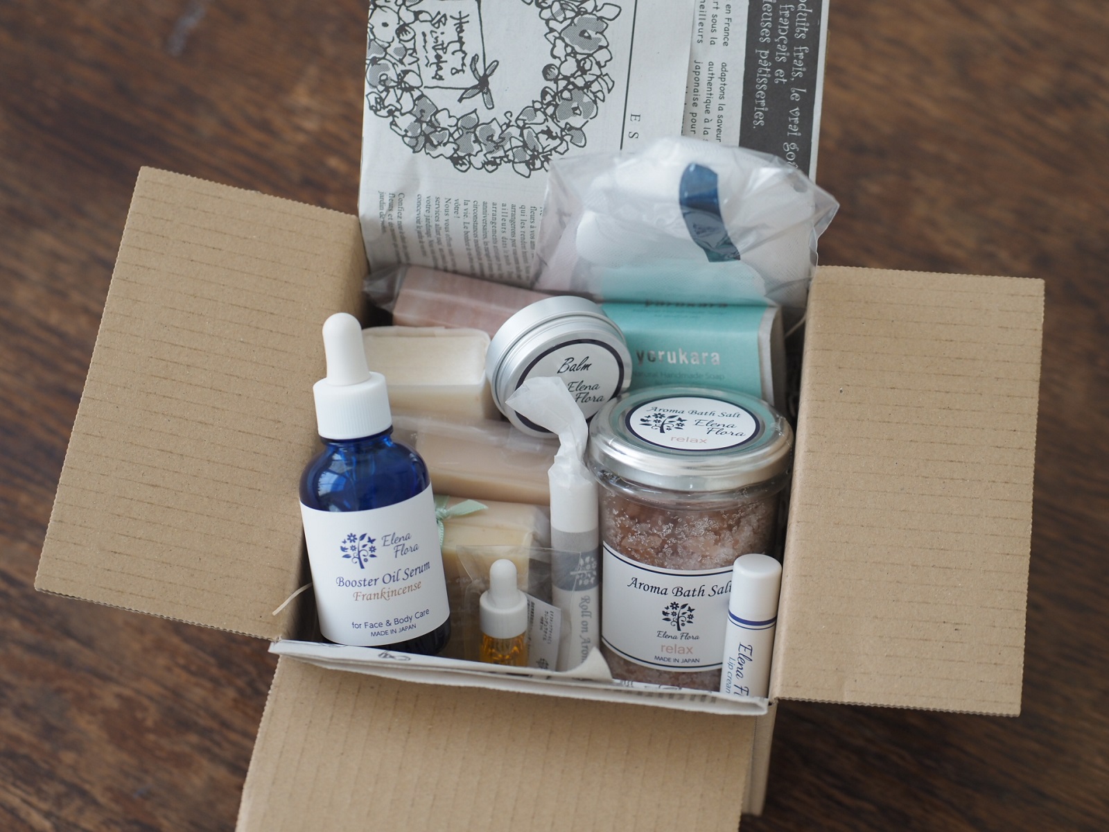 石けん3〜5種類(少し小さめや傷のあるアウトレット石けんや、普段販売していない石けんも組み合わせて入れさせていただきます)、スキンケアオイル、スキンケアバーム、リップクリーム、ロールオンアロマ(ネイル用オイル)、バスソルト、泡立てネット + おまけのミニ石けんや削り落し等 の詰合せです。